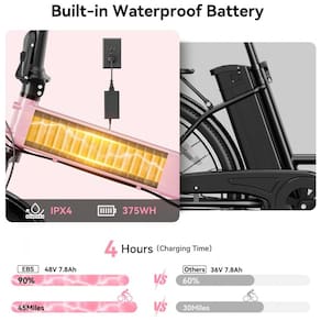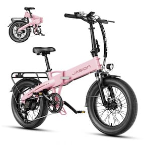 A bicicleta elétrica dobrável Jasion EB6 na cor rosa claro é indicada para adultos em deslocamentos urbanos, trilhas leves, neve e uso recreativo, combinando quadro em alumínio com motor brushless de 500W e potência de pico de 1000W, atingindo cerca de 37–40 km/h em condições ideais. A bateria embutida removível de íons de lítio 48V 10,5Ah (aproximadamente 504Wh) garante até cerca de 88 km de autonomia em modo de assistência de pedal, variando conforme peso do usuário, relevo e modo de uso.
