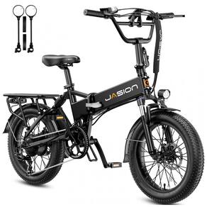 A Jasion EB7 2.0 preta sólida é uma bicicleta elétrica dobrável com pneus largos 20x3, indicada para adultos que desejam uma e-bike versátil para uso em cidade, cascalho, estrada, trilhas leves, areia e neve. O quadro metálico dobrável, aliado à suspensão dupla e pneus fat resistentes a furos, proporciona boa estabilidade e absorção de impactos em diferentes tipos de terreno.