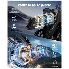 O sistema elétrico utiliza motor traseiro com potência de pico de 1200W e torque de 55Nm, permitindo atingir até cerca de 45 km/h e vencer aclives de aproximadamente 25° com apoio do motor. A bateria de íons de lítio de 48V e 10Ah (480Wh), removível e recarregável, oferece autonomia de até 55 km por carga em uso com assistência ao pedal, variando conforme relevo, peso do usuário e nível de assistência utilizado.