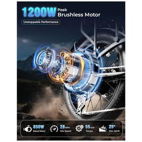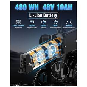 O conjunto utiliza motor traseiro brushless com potência de pico em torno de 1200W (aprox. 1,61 HP ou 1,63 CV), torque de cerca de 55Nm e velocidade máxima próxima de 45 km/h, permitindo enfrentar aclives de até aproximadamente 25° com apoio do motor. A bateria de íons de lítio de 48V e 10Ah, com energia de 480Wh, é removível, possui certificação UL e oferece autonomia em torno de 35 a 55 km em modo de assistência ao pedal, variando conforme o modo de uso, relevo e peso do ciclista.