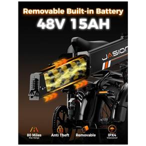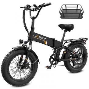 A bicicleta elétrica dobrável Jasion Hunter Pro na cor preto anoitecer é indicada para uso adulto em deslocamentos urbanos, estradas e trilhas leves, combinando quadro em alumínio com pneus largos 20" x 4,0" para maior estabilidade e tração em diferentes tipos de terreno. O motor brushless traseiro entrega 1000W de potência nominal, com pico de 1800W e torque de até 95 Nm, permitindo atingir velocidades acima de 30 mph, cerca de 48 km/h, com boa capacidade de aceleração e desempenho em subidas.