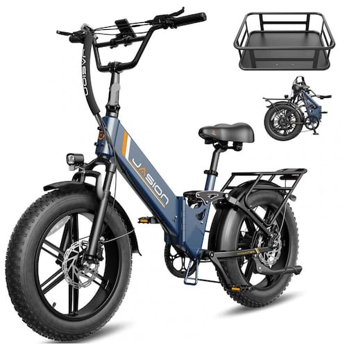A bicicleta elétrica dobrável Jasion X-Hunter ST azul Storm foi desenvolvida para adultos que buscam um modelo compacto com quadro rebaixado para uso urbano, trilhas leves e deslocamentos em diferentes tipos de terreno. O quadro em alumínio tipo step-through facilita subir e descer da bicicleta, enquanto os pneus largos 20 x 4 e a suspensão dupla proporcionam estabilidade e conforto em vias pavimentadas, estradas de terra, cascalho, neve e areia.