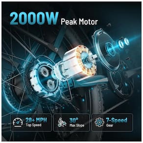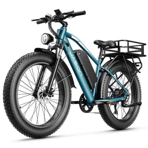 A bicicleta elétrica Jasion EB5 MAX azul é uma mountain bike elétrica para adultos com pneus largos 26x4, quadro em aço carbono e motor traseiro brushless de aproximadamente 750W de potência nominal e até 2000W de potência de pico, adequada para uso em trilhas leves e deslocamentos urbanos. A bateria de íons de lítio de 48V 15Ah, com 720Wh de energia, é removível e bloqueável, oferecendo autonomia de até cerca de 105 km em modo pedal assistido e em torno de 56 km em uso com maior predominância do acelerador, variando conforme o modo selecionado, peso do usuário e condições do trajeto.