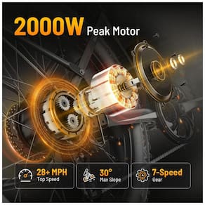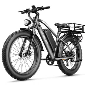 A suspensão dianteira com função de travamento auxilia na absorção de impactos em pisos irregulares e pode ser ajustada para trechos mais planos, otimizando a eficiência de pedalada. Os pneus 26x4 resistentes a perfurações proporcionam boa aderência em areia, lama, cascalho e pavimento molhado, enquanto os freios a disco com discos de 180 mm nas duas rodas oferecem capacidade de frenagem adequada em diferentes condições de uso.