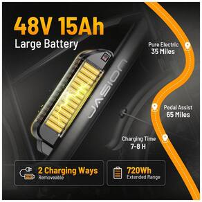 Desfrute de toda potência com a bicicleta elétrica Jasion EB5 MAX, equipada com um motor de pico de 1500W que atinge velocidades de até 45 km/h com facilidade. Supere subidas íngremes com facilidade, graças à sua capacidade robusta de escalada. Com uma bateria de 48V 15Ah, percorra até 104 km com assistência e 56 km no modo acelerador. O design removível e travável da bateria garante conveniência e segurança. Tenha total visibilidade com o display colorido, que mostra estatísticas em tempo real e oferece controle de cruzeiro. As luzes dianteiras e traseiras maiores proporcionam maior segurança, principalmente em condições de pouca luz. Com pneus largos de 26 x 4.0 polegadas, a EB5 MAX oferece excelente aderência em diferentes terrenos, enquanto o garfo de suspensão absorve impactos, garantindo conforto. Com capacidade para transportar itens essenciais, essa bicicleta é ideal para uso diário ou aventuras.
