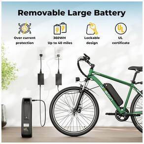 A bicicleta elétrica Jasion EB5 na cor verde é indicada para uso adulto em deslocamentos urbanos e trajetos com relevo variado, combinando motor elétrico brushless com potência nominal de 350W e pico de 1000W com quadro em aço carbono de alta resistência. A bateria de íons de lítio removível com 360Wh oferece autonomia estimada entre 40 e 64 km por carga, com tempo de recarga em torno de 5 a 6 horas, adequada para uso diário em percursos de ida e volta.