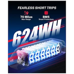 O motor traseiro brushless tem 750 W de potência nominal, com pico de 2000 W e torque máximo de 99 Nm, permitindo atingir aproximadamente 48 km/h em condições ideais, em conjunto com câmbio de 7 marchas e quatro modos de uso: elétrico puro, pedal assistido, pedal livre e modo cruzeiro. A alimentação é feita por bateria removível de íons de lítio 48 V 13 Ah, com energia em torno de 608 Wh, oferecendo autonomia estimada de até 70 milhas em modo PAS e tempo de recarga aproximado de 4 horas.