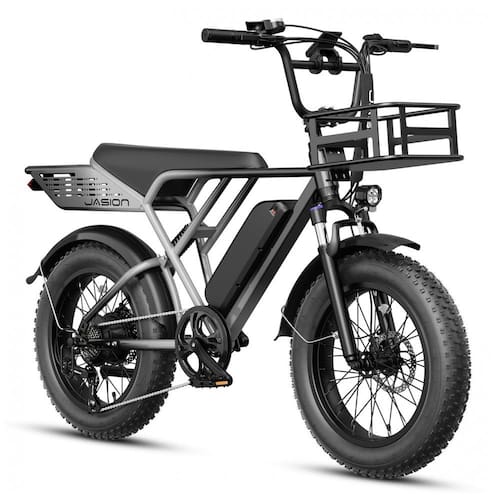 A bicicleta elétrica Jasion RetroVolt na cor cinza é um modelo adulto com quadro em aço carbono de alta resistência, projetado para uso urbano e off-road leve, com foco em estabilidade e conforto. A configuração com pneus largos 20 x 4 cm aumenta a área de contato com o solo, contribuindo para melhor tração e controle em asfalto, terra, areia, cascalho e superfícies irregulares. A cesta frontal integrada amplia a capacidade de transporte para pequenos volumes, tornando o conjunto adequado para deslocamentos diários e tarefas de rotina.