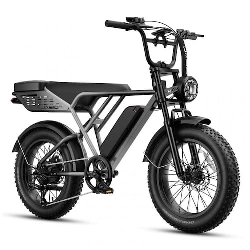 A bicicleta elétrica Jasion RetroVolt Pro na cor cinza degradê utiliza estrutura em aço carbono de alta resistência com motor brushless de 750W que atinge pico de 3000W, oferecendo torque elevado para velocidades máximas de 61 km/h conforme modo de assistência e condições do percurso. Os pneus fat tire 20 x 4 proporcionam tração otimizada em asfalto, terra, cascalho e terrenos irregulares, enquanto a suspensão dupla absorve vibrações para condução estável em uso urbano e off-road.