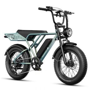 A bicicleta elétrica Jasion RetroVolt Pro na cor verde utiliza quadro em aço carbono reforçado e motor brushless de 750W com pico de 3000W, entregando torque de 120 Nm e velocidade máxima de 61 km/h conforme modo de assistência e condições do terreno. Os pneus fat tire 20 x 4 garantem aderência em superfícies diversas como asfalto, terra, cascalho, areia e neve leve, enquanto a suspensão dupla absorve irregularidades para maior controle em uso urbano e off-road.