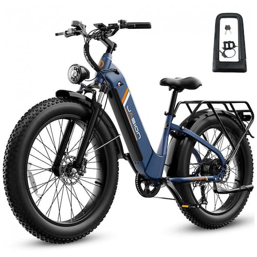 Os pneus 26x4 aumentam a área de contato com o solo, oferecendo tração em superfícies irregulares como cascalho, neve e areia, além de maior estabilidade em uso urbano. A suspensão dianteira auxilia na absorção de impactos em pisos com desníveis, enquanto os freios a disco hidráulicos nas duas rodas favorecem frenagens mais progressivas em diferentes condições climáticas e de velocidade.