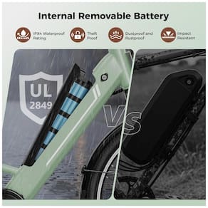 A bicicleta elétrica Jasion YC1 ST na cor verde é indicada para adultos em deslocamentos urbanos, estradas e trilhas leves, reunindo quadro em aço carbono de alta resistência e motor brushless com potência de pico de 1200W. A bateria interna removível de íons de lítio com 360Wh, com sistema de gerenciamento eletrônico (BMS), pode ser recarregada em aproximadamente 5 a 6 horas e oferece autonomia de até cerca de 80 km em modo de assistência de pedal, dependendo do modo selecionado, relevo e peso do usuário.