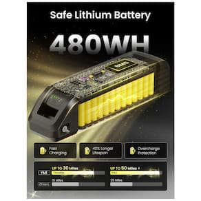 A bicicleta elétrica Jasion YM1 preta é uma mountain bike elétrica para adultos com pneus 27,5, quadro em aço carbono de alta resistência e motor brushless de 1200W de potência de pico, indicada para deslocamentos urbanos, estradas pavimentadas, cascalho e trilhas leves. A bateria de íons de lítio de 48V 10Ah, com 480Wh de energia, é removível e recarregável, oferecendo autonomia entre aproximadamente 50 e 80 km em modo de assistência ao pedal, de acordo com o nível de assistência selecionado, peso do usuário e características do trajeto.