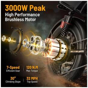 O sistema de assistência elétrica combina modos de pedal assistido, acelerador e modo totalmente elétrico com transmissão de 7 marchas, permitindo ajustar o apoio do motor e a cadência de pedal nas diferentes condições de uso. A suspensão dupla, com garfo dianteiro e amortecedores traseiros, em conjunto com os pneus 20x4, auxilia na absorção de impactos em pisos irregulares, favorecendo conforto e controle em percursos urbanos e trilhas.