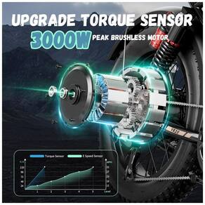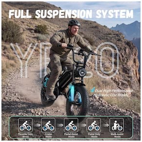O sistema de assistência elétrica combina modos de pedal assistido, acelerador e modo totalmente elétrico com transmissão de 7 marchas, permitindo ajustar o apoio do motor e a cadência de pedal em diferentes condições de uso. Os pneus 20x4 e a suspensão dupla ajudam a absorver impactos em pisos irregulares, favorecendo conforto e controle em percursos urbanos e trilhas.