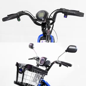 Painel digital em LCD com exibição de: indicador de nível de bateria, velocímetro, hodômetro, painel de tensão de bateria e parada (P)Acelerador na manoplaPedais: Pedal assistido (pedal system)Cesta dianteira com travaBanco ergonômico com molasItens inclusos: