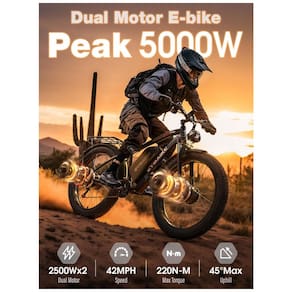 Bicicleta elétrica EYBAIKC C5PRO equipa motores duplos de pico 5000W (modo único ou duplo ativado por botão no guidão), com torque de 220 Nm para inclinações até 45°. Bateria removível 52V 32Ah (1664 Wh) com BMS suporta autonomia de até 160 km por carga, variando conforme terreno e modo de pedalada. Projetada para terrenos variados como estrada, grama, neve, areia e montanha, com pneus fat 24" x 4.0 (61 cm x 10,2 cm) e suspensão frontal para absorção de impactos. Estrutura em alumínio com transmissão Shimano 7 velocidades (21 marchas totais) e trocador integrado traseiro. Freios hidráulicos duplos de disco proporcionam resposta precisa em frenagens. Display LCD 3.5" exibe velocidade, bateria e quilometragem; farol LED frontal e luzes traseiras integradas melhoram visibilidade noturna. Pneus fat resistentes a furos oferecem tração em superfícies irregulares, como neve ou praias. Suspensão frontal dupla absorve vibrações de terrenos acidentados. Bateria com trava de chave permite recarga em casa ou escritório; suporta mais de 1000 ciclos. Compatível com modos de assistência elétrica classe 3, incluindo pedal assist e acelerador. Corrente drive chain e cabos internos no quadro elevam segurança. Adequada para commuting urbano, trilhas off-road ou uso recreativo em adultos. Cuidados incluem verificação periódica de pressão dos pneus (recomendada 1,7-2,4 bar), limpeza da corrente com lubrificante específico e armazenamento da bateria em ambiente seco entre 0-40°C. Montagem requer instalação de guidão, selim e pedais (85% pré-montada); manual em inglês. Ficha Técnica • Dimensões do produto: Rodas 24" (61 cm); pneus 24" x 4.0 (61 cm x 10,2 cm); tamanho large.? • Peso do produto: Aproximadamente 35 kg (estimado para ebike fat tire similar).? • Peso total com embalagem cerca de 40 kg.? • Potência: Pico 5000W motores duplos brushless (64-72 km/h máx.).? • Capacidade da bateria: 52V 32Ah (1664 Wh) lítio com BMS; removível e trancável; >1000 ciclos.? • Materiais: Quadro alumínio; pneus fat resistentes a furos; selim inflável ampliado.? • Fonte de alimentação: Motor elétrico duplo; voltagem 52V.? • Faixa etária: Adultos.? • Conteúdo da caixa: Bicicleta (85% montada), bateria, carregador, buzina, suporte para celular com carregador 5V, manual do usuário.? • Manual do usuário: Idioma inglês.? • Freios: Hidráulicos disco duplos.? • Suspensão: Frontal dupla.? • Certificações: UL 2849 testada. Marca: Não Informado