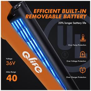 Bateria removível integrada: A bateria integrada desta e-bike possui certificação UL2849 antirroubo, enquanto as proteções contra superaquecimento, sobretensão e sobrecarga garantem um desempenho confiável e longa duração da bateria (alcance de 64 km | 36 V). A duração da bateria é significativamente estendida em 20% em comparação com baterias comuns.