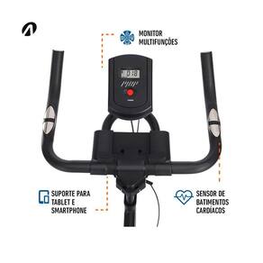 O guidão da Bike Spinning 6.0 possui ajuste vertical para melhor adequação da altura do atleta, sensor de pulso para medição dos batimentos cardíacos e suporte para tablet e celular. O Monitor possui funções de Tempo percorrido, Distância, Calorias, Velocidade, Sensor de Pulso e modo Scan que dispara todas as funções mudando a cada 3 segundos.
