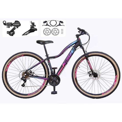 Bike aro 29 Ksw Mwza em alumínio, nova na caixa a pronta entrega, produto com ótima qualidade e acabamento, possui 24 marchas com câmbio dianteiro e traseiro Shimano e sistema de alavancas rapid fire que a cada clique uma marcha é trocada, garfo com suspensão, sistema de freio a disco hidráulico(óleo). Quadro com tubo rebaixado para facilitar subir e descer da bike. Bicicleta pré montada, vai precisar apenas fixar a roda dianteira, guidão, selim e pedais. Segue abaixo características da bike: Quadro Feminina 29 Ksw Mwza em alumínio 6061 / Garfo 29 suspensão curso 60mm / Suporte do guidão em alumínio preto / Guidão 31.8mm em alumínio preto / Canote do selim 27.2 sem carrinho / Selim Sport preto / Abraçadeira do Selim alumínio Preto / Aros Aero Parede dupla reforçado / Raios Pretos / Cubos Pretos aço / Pneus 29 cravudo / Movimento central selado rolamentado / Freios a disco Hidráulicos(a óleo) com discos inox 160mm / Alavancas Semi-automáticas Rapid Fire / Câmbio Traseiro shimano tz / Câmbio Dianteiro shimano tz / Corrente Index / Pedivela Aço Revestido / Pedal Plataforma Nylon preto / Roda Livre 8v index dourada (rosca) / Recomendamos que seja feita uma revisão por um técnico após a recebimento do produto, para reajuste e regulagem, pois no transporte pode acontecer de alguma peça soltar ou desregular / Fotos meramente ilustrativas