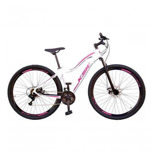 Bike Feminina aro 29 Ksw Mwza em alumínio, nova na caixa a pronta , produto com ótima qualidade e acabamento, possui 24 marchas com câmbio dianteiro e traseiro Shimano e sistema de alavancas rapid fire que a cada clique uma marcha é trocada, garfo com suspensão, sistema de freio a disco hidráulico(óleo). Quadro com tubo rebaixado para facilitar subir e descer da bike. Bicicleta pré montada, vai precisar apenas fixar a roda dianteira, guidão, selim e pedais. Segue abaixo características da bike: