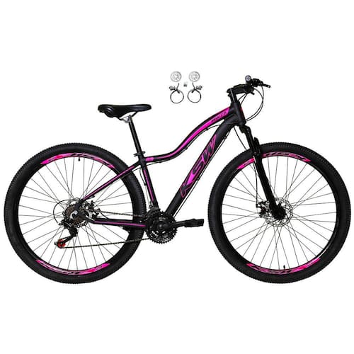 Bike feminina aro 29 em alumínio, nova na caixa a pronta entrega, produto com ótima qualidade e acabamento, possui 24 marchas com sistema de alavancas rapid fire que a cada clique uma marcha é trocada, garfo com suspensão, sistema de freio a disco hidráulico(óleo). Bicicleta pré montada, vai precisar apenas fixar a roda dianteira, guidão, selim e pedais.Segue abaixo características da bike:Quadro 29 ksw mwza em alumínioGarfo 29 suspensão curso 60mmSuporte do guidão em alumínio pretoGuidão 31.8mm em alumínio pretoCanote do selim 27.2 s/carrinhoSelim Sport pretoAbraçadeira do Selim alumínio PretoAros Aero Parede dupla reforçadoRaios PretosCubos Pretos AçoPneus 29 cravudosMovimento central selado rolamentadoFreios a disco Hidráulicos com discos inox 160mmAlavancas Semi-automáticas Rapid FireCâmbio Traseiro Index Importado 8vCâmbio Dianteiro Index Importado 3vCorrente Index 24vPedivela Aço RevestidoPedal Plataforma Nylon pretoRoda Livre 8v index dourada(rosca)