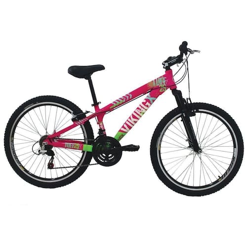 Bicicleta Freeride Aro 26 21 Vel Rosa/verde Vikingx Tuff25 Bicicleta Freeride Aro 26 Freio V-Break 21 Velocidades Câmbios Shimano Rosa/Verde VikingX TUFF25 Foi projetada para quem quer uma bike de personalidade e estilo inigualável. Ela oferece ao ciclista quadro diferenciado e design arrojado e exclusivo. Com qualidade, ela vem equipada de com 21 velocidades, permitindo ao ciclista a escolha da marcha ideal de acordo com o . O design moderno pode ser observado no quadro da bike e os pneus são confeccionados em MTB com aro 26, garantindo segurança total a cada manobra em qualquer tipo de terreno. Informações Técnicas: - Marca: VikingX - Modelo: MTB Freeride - Coleção/Sortimento: 2017 - Idade Recomendada: Juvenil/Adulto - Gênero: Unissex - Aro: 26 - Quadro: Alumínio - Marcha: 21 Marchas - Garfo: Suspensão - Guidão: Aço carbono MTB - Freios: V-Brake - Rodas: Aero - Câmbio: Shimano - Manoplas: MTB - Corrente: Index - Selim: WG - Trocador de Marcha: Grip -Shift - Pedivela: - Pneus: MTB 26" - Pedal: Plástico MTB - Conteúdo da Embalagem: 1 bicicleta e manual de instruções - Peso: 15,90 kg - Dimensões aproximadas da embalagem (AxLxP): 109 x 68 x 165cm - : 3 meses