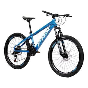 Descrições Marca: frx x90 lançamento Aro: aero 26 alumínio - parede dupla tipo vmaxx Quadro: alumínio Cubos: traseiro e dianteiro 36f sem blocagem Raio: 240 Câmera de ar: 26 importada Pneu: 26x1.95 preto liso Selim: mtb importado Canote: 27,2 Abraçadeira: alumínio com blocagem Mov. Central importado Mov. Direção: ahead set importado Pedivela: engrenagem tripla 24/34/42d Alavanca: aluminio 21v index Suporte guidão: alumínio ahead set preto Guidão: curvo expandido aço preto Roda livre: 7v index Câmbio traseiro importado Cambio dianteiro importado Pedal: 9/16 plataforma de nylon importado Garfo suspensão: 29/26 over aço preto Freio a disco: dianteiro e traseiro mecânico