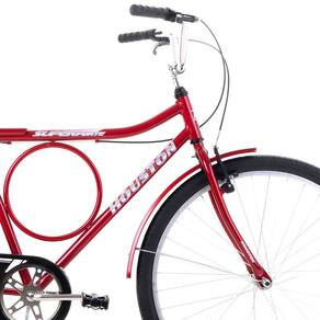 Características: Marca: Houston Modelo: Super Forte Aro: 26 em alumínio Quadro e guidão: Aço carbono Cesta: Aramada preta Paralamas: Aço carbono Selim: Largo com 2 molas Descanso lateral: Aço cromado Cubo dianteiro: 36 furos Freio: Sistema V-Brake Movimento central: 45mm Roda livre: 20 dentes Acessórios: Campainha, espelho, refletores e manuais