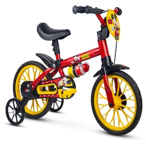 Bicicleta Mickey Aro 12   As bicicletas aro 12” Nathor são equipadas com os melhores itens de segurança e conforto para crianças. Com o limitador de giro, a criança garante mais equilíbrio e segurança ao pedalar. A regulagem de ângulo do guidão e da altura do selim permitem que a postura do ciclista se mantenha correta, além de possibilitar que a bicicleta seja usada por mais tempo – acompanhando o crescimento. O movimento central avançado facilita o pedalar, estimulando o aprendizado. A aro 12” Nathor também tem uma relação de transmissão que foi desenvolvida para que a velocidade que a criança atinge pedalando seja a mesma de um adulto andando; ou seja: os pais conseguem acompanhar a brincadeira com tranquilidade, garantindo ainda mais segurança durante a diversão! Indicada para crianças a partir de 3 anos ou com altura entre 90cm e 1m. Resistência e segurança para começar a pedalar!   Características: - Quadro, garfo e guidão em aço carbono - Limitador de giro do guidão - Pneus em E.V.A - Plaquinha - Mesa de direção em nylon reforçado - Selim com regulagem de altura - Freio dianteiro a tambor - Trava de segurança   Informações Técnicas: - Tamanho da roda: 12? - Altura máxima recomendada: 90 cm a 100 cm - Peso máximo recomendado: 21 kg - Peso do produto: 3,980 Kg - Peso com a embalagem: 4,720 Kg - Cubagem: 0,04 m³ - Dimensões do produto (CxAxL): 82cm x 55cm x 50cm - Dimensões da embalagem (CxAxL): 69cm x 31cm x 18cm   Atenção: os produtos podem conter pequena variação no modelo do pneu Registro INMETRO - CE-BIC/INNAC 00407-01A NBR NM 301/2004