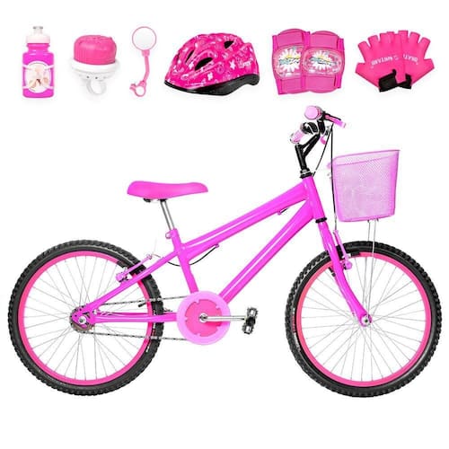 Bicicleta Infantil Feminina Aro 20 Alumínio Colorido + Kit Proteção Cor Pink