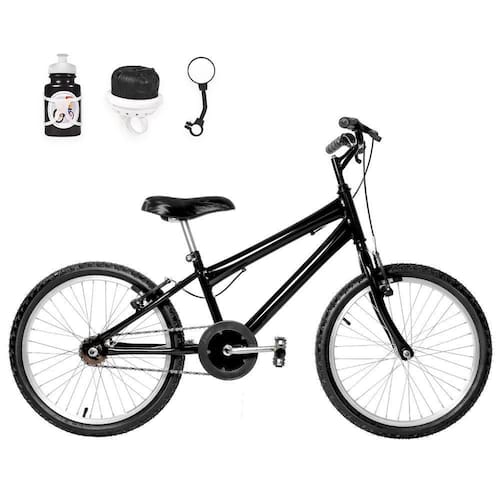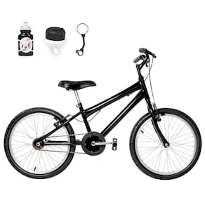 Bicicleta Infantil Masculina Aro 20 Alumínio + Kit Passeio Cor PretaABicicleta Infantil Masculina Aro 20 Alumínio FlexBikes é ideal para os meninos se diirem muito, com conforto e segurança.Com design moderno e variedade em cores vibrantes, a bicicleta conta com itens de segurança certificados pelo Inmetro, banco (selim) macio e confortável, protetor de coroa e freios v-brake de alta frenagem.Para auxiliar nas pedaladas, dispõe de rodinhas laterais e a opção de utilizar o descanso lateral que também acompanha o produto.A aro 20 é recomendada para crianças de 5 a 7 anos, pesando até 38 kg.Sobre o Kit PasseioConfira o que está incluso nesse kit:01 Garrafinha de água