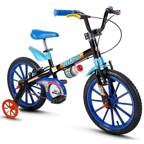 Ela vem acompanhada de uma garrafinha. A Tech Boys Aro 16 fará a alegria dos meninos que querem diversão e aventura.