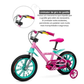 Características técnicas: Idade recomendada: a partir de 5 anos Cor predominante: rosa Peso máximo recomendado: 25 kg Altura máxima recomendada: 95 cm a 110 cm Aro: 14 Quadro em alumínio Limitador de giro do guidão Freio traseiro a disco Regulagem de ângulo do guidão Aro em abs Pneus e câmara de borracha Eixos dianteiro e traseiro com rolamentos Selim em pu com abraçadeira em alumínio e trava de segurança Maçaneta em nylon reforçado e com ajuste de freio Rodinhas laterais com 5 regulagens de altura Atenção: os produtos podem conter variação no modelo do pneu