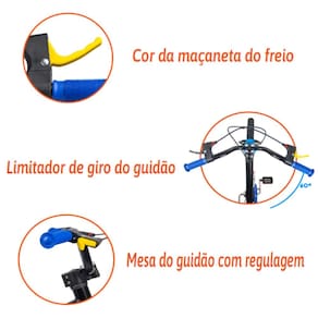 Características: - Quadro, garfo e guidão em aço carbono - Limitador de giro do guidão - Freios v-brake com maçanetas em nylon reforçado e ajuste - Mesa headset com regulagem de ângulo do guidão - Rodinhas laterais - Aro em alumínio ou Aro em ABS - Para-lamas em ABS - Arruela com trava de segurança - Pneus com câmara - Abraçadeira do selim em alumínio - Garrafinha