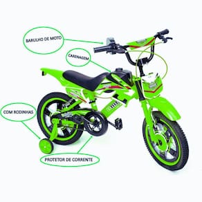 Principais Benefícios: - Design Exclusivo: Inspirada nas famosas motocicletas de cross, esta bicicleta possui um design arrojado que vai encantar os pequenos apaixonados por aventura. - Segurança em Primeiro Lugar: Certificada pelo INMETRO, oferece tranquilidade aos pais com para-lamas dianteiro e traseiro, cobre-corrente envolvente e rodinhas laterais para auxiliar nas primeiras pedaladas. - Construção Robusta: Com quadro, garfo e guidão em aço, esta bicicleta garante resistência e durabilidade, proporcionando uma experiência de uso segura e confiável. - Fácil Montagem: Enviada semi-montada, a montagem é simples e rápida, exigindo apenas a colocação do guidão, roda dianteira e pedais. Assim, a diversão está garantida em questão de minutos! *Montagem de responsabilidade do cliente*