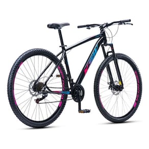A suspensão dianteira auxilia na absorção de impactos em terrenos irregulares, e o pedivela triplo em aço garante maior eficiência durante o uso. Os pneus 29x2.10 oferecem boa aderência, e o selim ergonômico MTB proporciona conforto em pedaladas prolongadas.