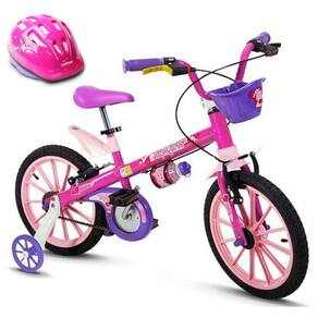 Bicicleta para menina Top Girls Aro 16 Nathor com Capacete RosaA Nathor é a maior fabricante de bicicletas infantis da América Latina, sendo também responsável pelo abastecimento de grandes marcas.A bicicleta Top Girls Aro 16 possui limitador de giro do guidão, importante característica que evita que o guidão dê uma volta completa e danifique o freio, preservando a integridade física da criança.Com freios V-Brake e maçaneta em Nylon, garante uma ótima rigidez, fazendo com que a frenagem seja mais eficiente por não sofrer deformação.Outro detalhe importante é que o manete do freio traseiro está destacado na cor Amarela.Isso auxiliará seu filho no momento de frear, garantindo ainda mais segurança.Os pneus possuem câmara e o quadro é em aço carbono.Ela vem acompanhada de uma garrafinha e uma linda cestinha.As cores rosa e lilás dão um toque todo especial e feminino.- Mesa(com regulagem de ângulo)- Paralama em ABS- Aro em ABS- Regulagem de altura das rodas laterais- Limitador de giro do guidão- Maçaneta em nylon reforçado e com ajuste do freio- Maçaneta: Cor em destaque para facilitar a identificação do freio traseiro.- Movimento de direção com esferas- Arruela com trava de segurança- Pneus com câmara- Quadro, garfo e guidão em aço carbono- Abraçadeira Quick Release- Freios V-brake- Garrafinha- Cestinha- Idade recomendada: dos 5 aos 8 anos- Altura Recomendada: 110 - 120cm- Peso máximo suportado: 30kgInvista na segurança e diversão de seu filho!Como você receberá a Bicicleta?Todas as Bicicletas são enviadas semi-montadas, com algumas partes desencaixadas/desmontadas para melhor acomodação na caixa.Caso tenha um conhecimento básico, você mesmo poderá montar a bicicleta, mas recomendamos que a montagem seja feita em uma oficina especializada, para garantir o máximo de desempenho e segurança.O custo da montagem é de responsabilidade do comprador.