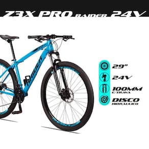 A Bicicleta Z3X PRO Aro 29 Quadro Alumínio 24v Shimano Acera Freio a Disco Hidráulico é a opção certa para você que pretende adotar um estilo de vida mais saudável. Seja para passeios urbanos, trilhas leves e moderadas, ou até como seu principal meio de , a bicicleta pode trazer inúmeros benefícios para a sua saúde, além de uma qualidade de vida garantida. A Mountain Bike Raider Z3X PRO é produzida em quadro ergonômico de alumínio e possui e tamanhos para você escolher. Além disso este equipamento oferece um desempenho incrível em área urbana e íngreme pois foi desenvolvida com componentes super importantes para uma boa performance, possui suspensão com trava no ombro e é capaz também de combinar 24 velocidades com trocador Rapid Fire que oferece ótimo desempenho em terrenos elevados. Já o freio a disco hidráulico proporciona muito mais e tranquilidade nas frenagens. Invista em sua saúde mental e corporal, afinal pedalar é vida! Compre já!