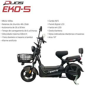 A Bicicleta Elétrica Duos Eko 5 é a escolha ideal para quem busca mobilidade urbana prática, econômica e sustentável. Equipada com painel digital, sistema de alarme, faróis em LED e freios a tambor, oferece conforto, segurança e eficiência para o dia a dia. Não precisa de CNH, emplacamento ou licenciamento.