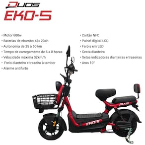 A Bicicleta Elétrica Duos Eko 5 é a escolha ideal para quem busca mobilidade urbana prática, econômica e sustentável. Equipada com painel digital, sistema de alarme, faróis em LED e freios a tambor, oferece conforto, segurança e eficiência para o dia a dia. Não precisa de CNH, emplacamento ou licenciamento.