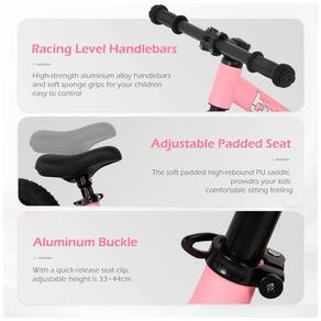 HANLERBAR E ASSENTO Guiador antiderrapante de nível de corrida para um passeio e confortável. Assento ajustável com altura de cerca de 33 a 44 centímetros, pode ser ajustado para crianças de acordo com sua altura. Os grampos de assento de liberação rápida em alumínio permitem ajustes de altura do selim sem ferramentas. Um apoio para os pés em forma de U enrolado em ambos os lados, permitindo que as crianças relaxem os pés enquanto andam de bicicleta.