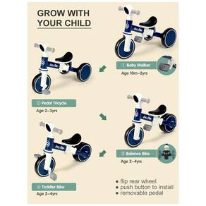 1 MIN MONTAGEM A bicicleta de equilíbrio para brinquedos de 1 a 4 anos vem com um pacote compacto. Sem peças pequenas, sem ferramentas necessárias. Basta pressionar os botões para instalar a bicicleta, remover os pedais e alternar as rodas traseiras em diferentes modos.
