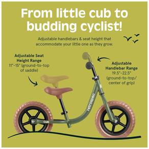 ALTURA MÍNIMA DO ASSENTO DE Cub 2 é capaz de suportar crianças menores do que a maioria das bicicletas de equilíbrio para bebês. Seu assento e guidão ajustáveis foram feitos para crescer com eles.