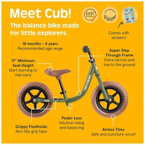 APRENDA A ANDAR CEDO As bicicletas de equilíbrio permitem que crianças de até 18 meses aprendam em seu próprio ritmo e ajudem a aumentar sua confiança em duas rodas. A estrutura estreita e discreta do Cub 2 é fácil para as crianças entrarem e saírem e as mantém em uma altura segura.