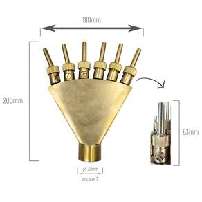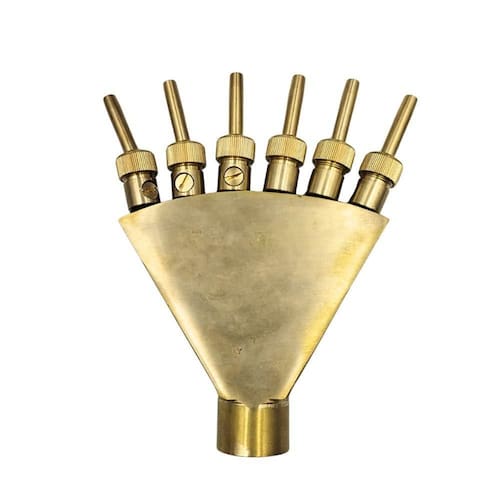 Características: Conexão: Rosca Interna de 1 Material: Latão Saída: 6 bicos com saída de 5mm Pressão Suportada: 50 - 150 Kpa Volume do Jato de Água: 6,5 - 13,5 m/h Altura Média do Jato de Água: 2-4 metros