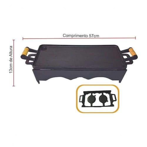 Rechaud/Bifeteira confeccionado em ferro fundido de alta qualidade, com 2 chamas, medidas 25x45cm e 13cm de altura. Os produtos de ferro fundido tem como principal característica passar um pouco do ferro para os alimentos, garantindo sua necessidade do mineral para ter uma vida mais saudável. Os utensílios fabricados em ferro fundido além da praticidade, também apresentam boa durabilidade, preço baixo e, segundo especialistas, seu uso regular pode reduzir o risco de anemia e deficiência de ferro.