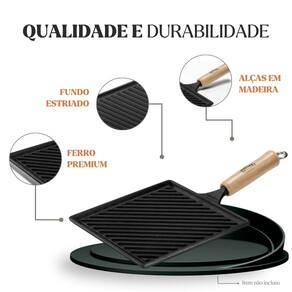 Material: Ferro fundido Material do cabo: Madeira Medidas: 22 × 22 × 1,5 cm Peso: 2,13kg