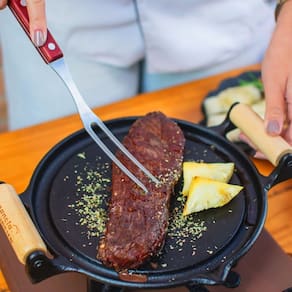 A Bifeteira Fogo Forte Alça de Madeira da Panela Mineira é um produto moderno, prático e eficiente, que apresenta alto desempenho no preparo de diversas receitas. O calor distribuído por toda a superfície faz com que o alimento cozinhe de maneira uniforme, conservando suas propriedades e nutrientes, o que a torna excelente para selar, grelhar, fritar, cozinhar e mais. Muito utilizada por bares e restaurantes para servir porções devido a sua resistência, boa apresentação e por manter-se quente por mais tempo.