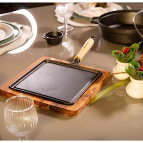 Prática e versátil, a bifeteira lisa com suporte de madeira é a escolha ideal para chefs de cozinha e donos de estabelecimentos, devido a sua resistência, boa apresentação e por manter-se quente por muito tempo